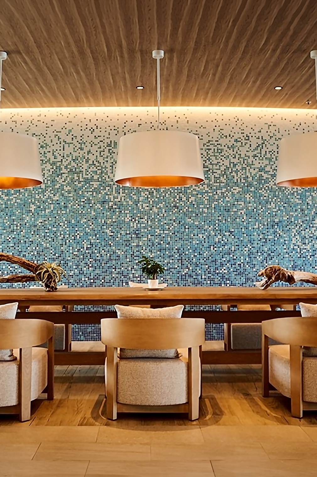 In the renovation project of the resort hotel "il azzurri," located in Dogashima Onsen, Nishi-Izu, Shizuoka Prefecture, we served as the main contractor, comprehensively handling the architecture, electrical and mechanical equipment works, and FF&E (furniture and custom lighting) works. We managed the renewal of major areas ranging from the guest rooms and lobby lounge to the main restaurant.