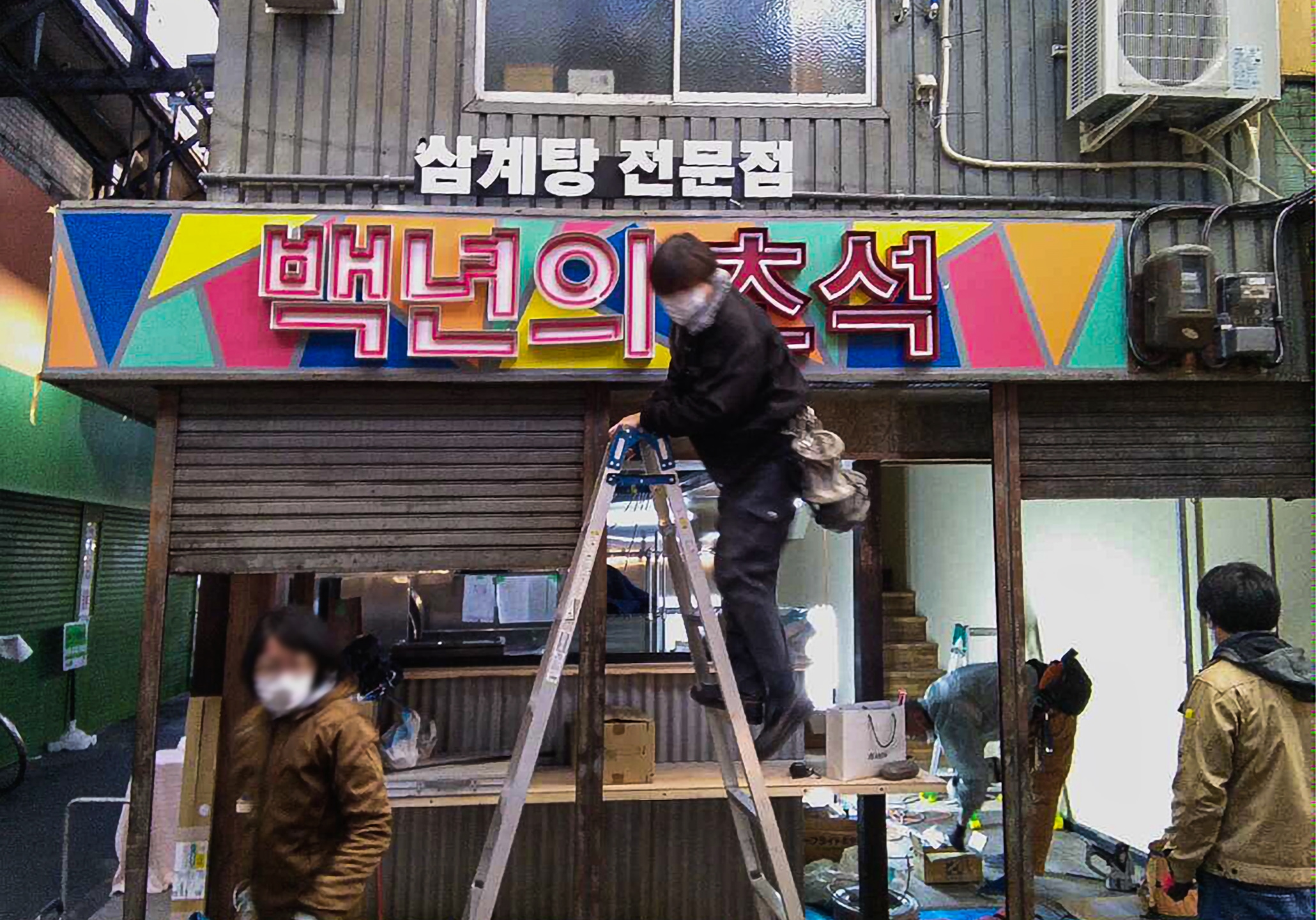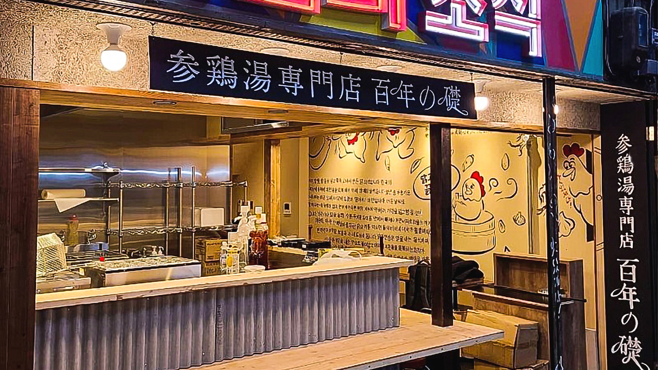 大阪・鶴橋商店街内に位置する「鶏白湯専門店 百年の礎」の店舗構築において、建築・電気設備工事から、FFE(家具)および特注照明工事までを元請けとして一括担当。