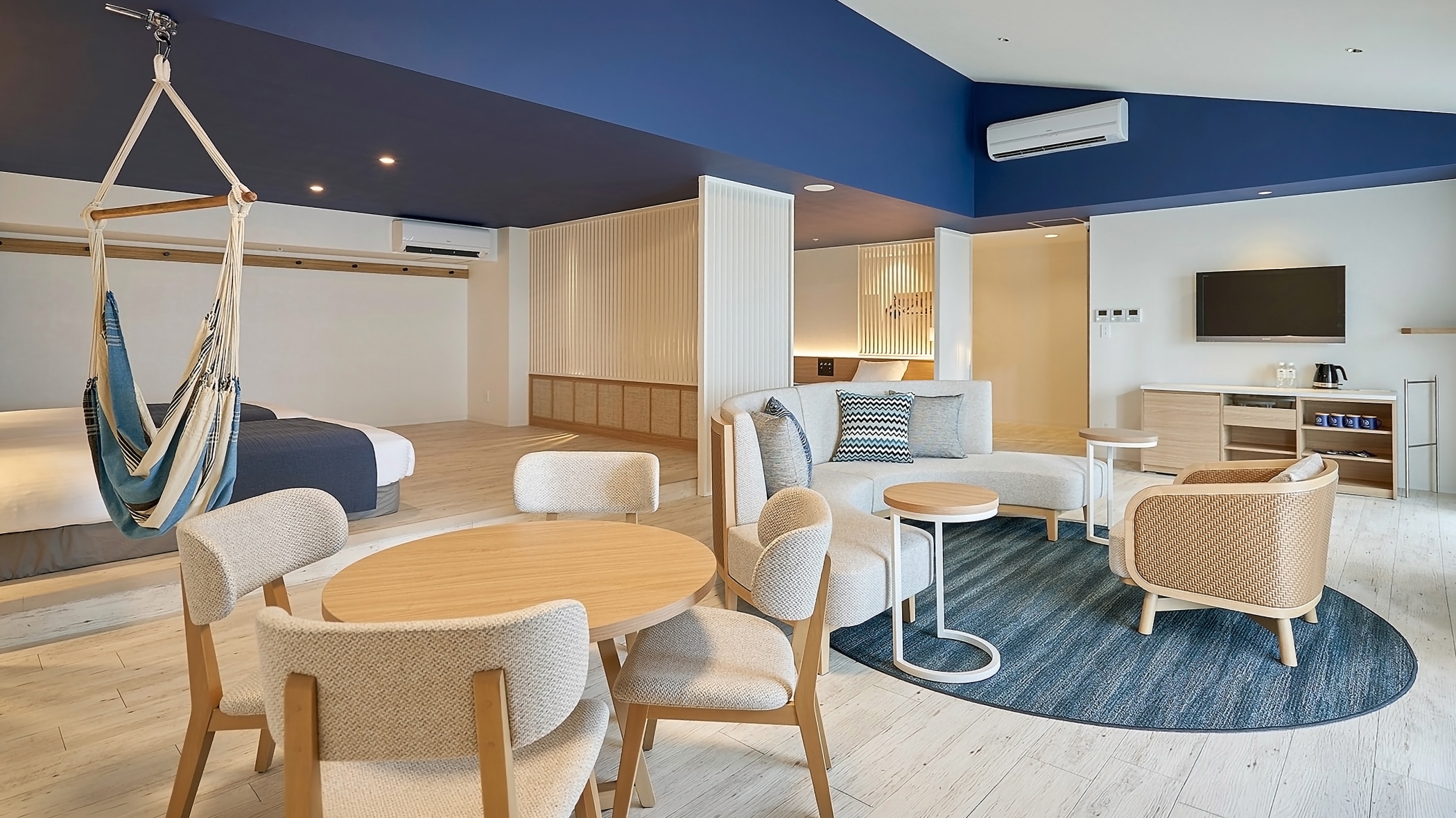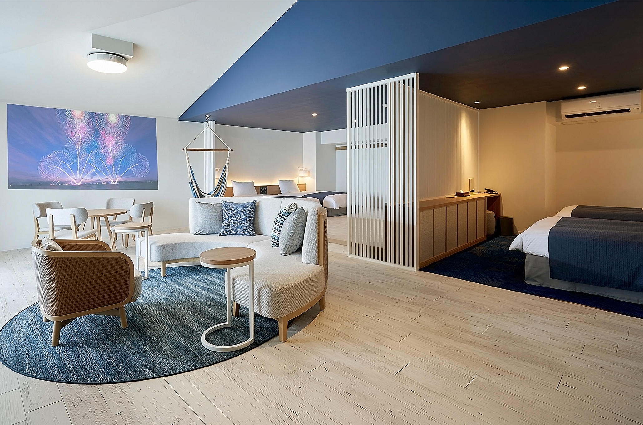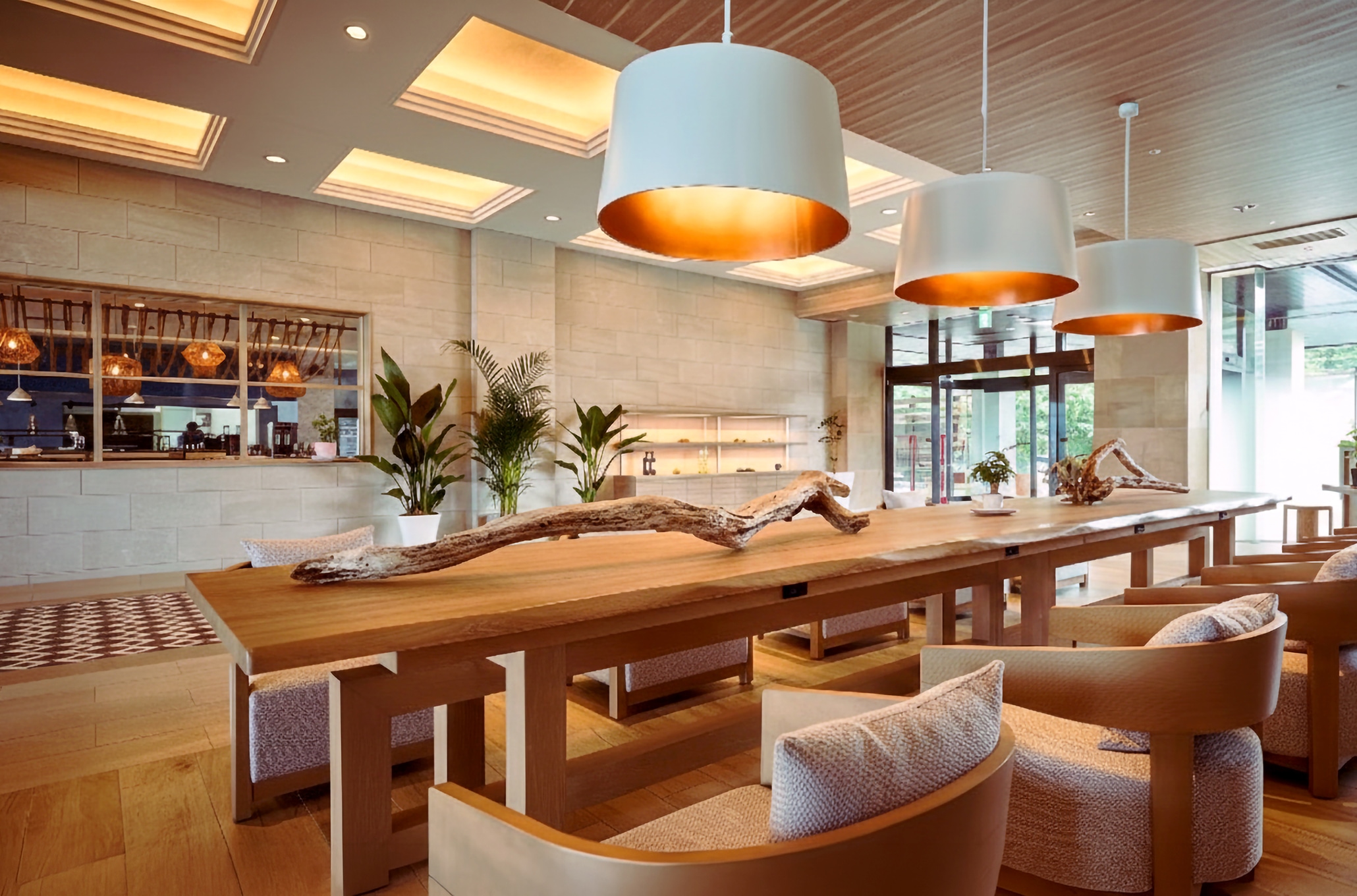 静岡県西伊豆・堂ヶ島温泉に位置するリゾートホテル「イル・アズーリ」の改修プロジェクトにおいて、建築、電気・機械設備、およびFFE(家具・特注照明)工事を元請けとして一括担当。客室、ロビーラウンジ、そしてメインレストランに至る主要エリアの刷新を手掛けました。