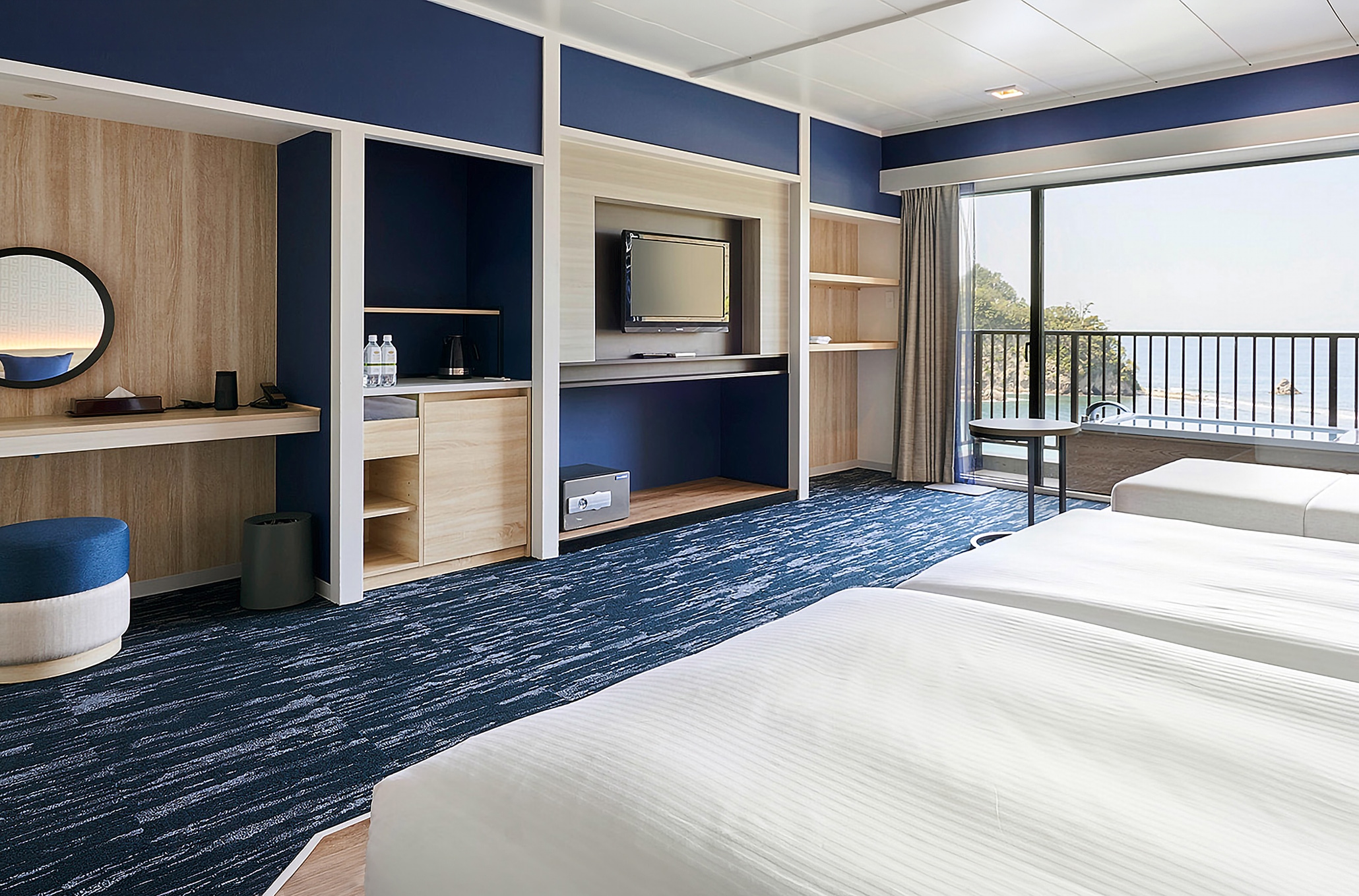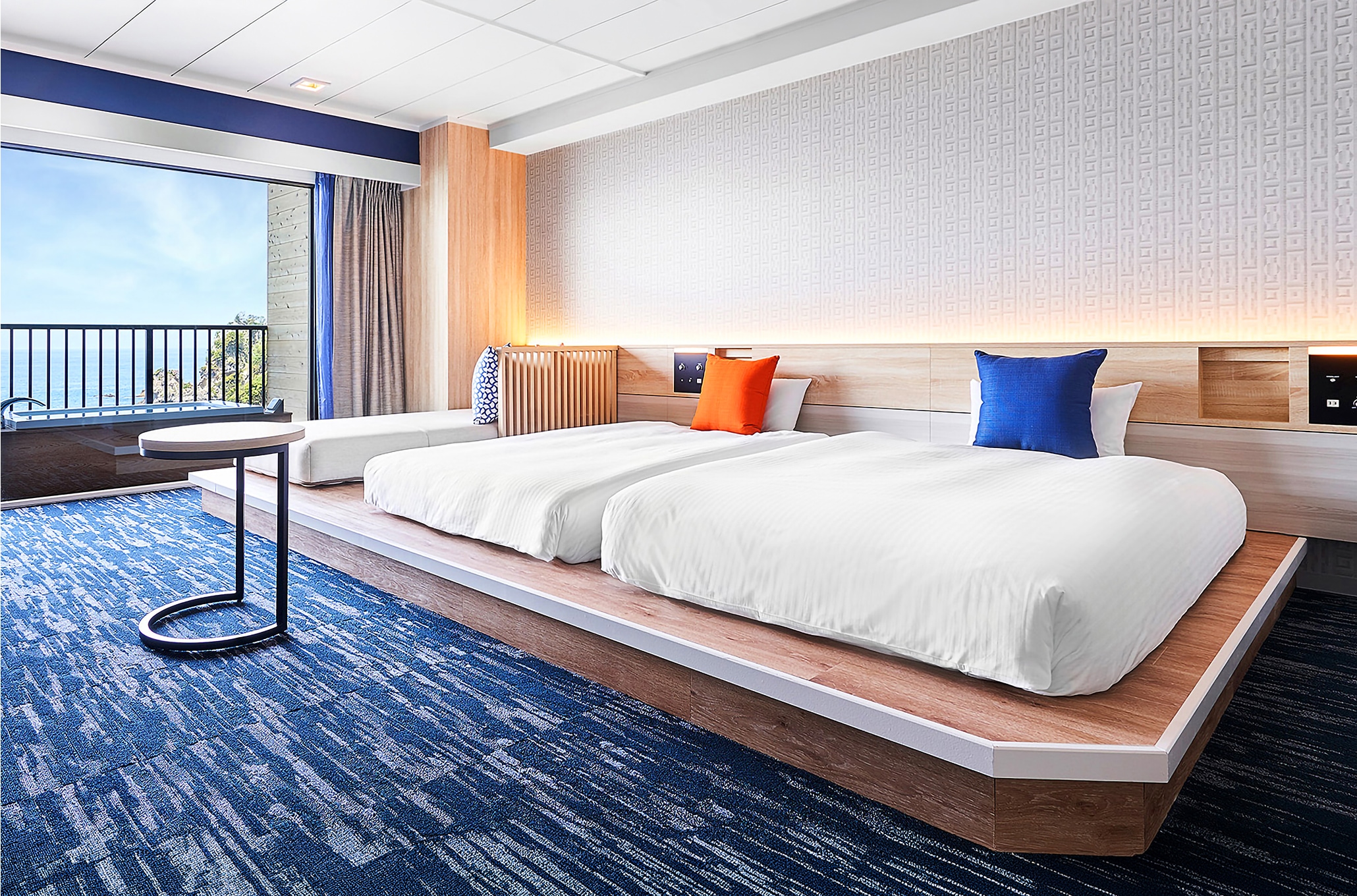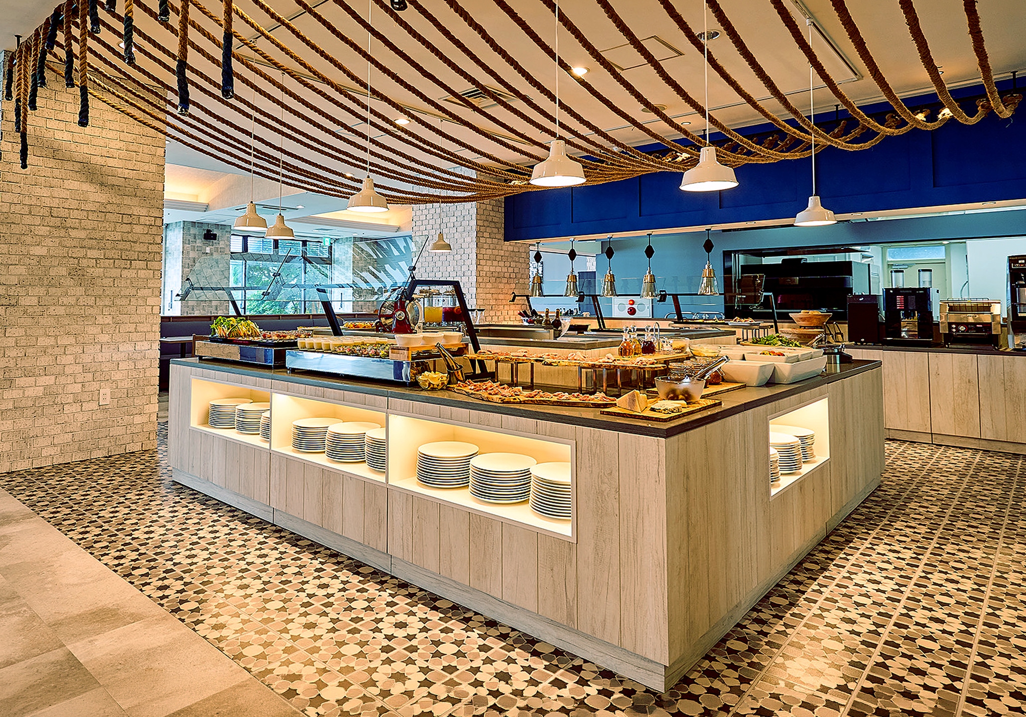 全客室がオーシャンビューというロケーションを活かし、イタリアンテイストと開放感あふれる内装と上質な家具を配置。また、中央にオープンキッチンを擁するレストラン「Taverna di Mare」では、ライブ感溢れる空間演出と、機能的な設備設計を両立させました。デザインとインフラの両面からホテルの資産価値を高めるトータルな施工管理を遂行しています。