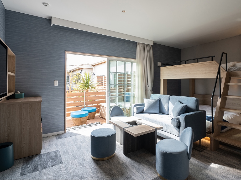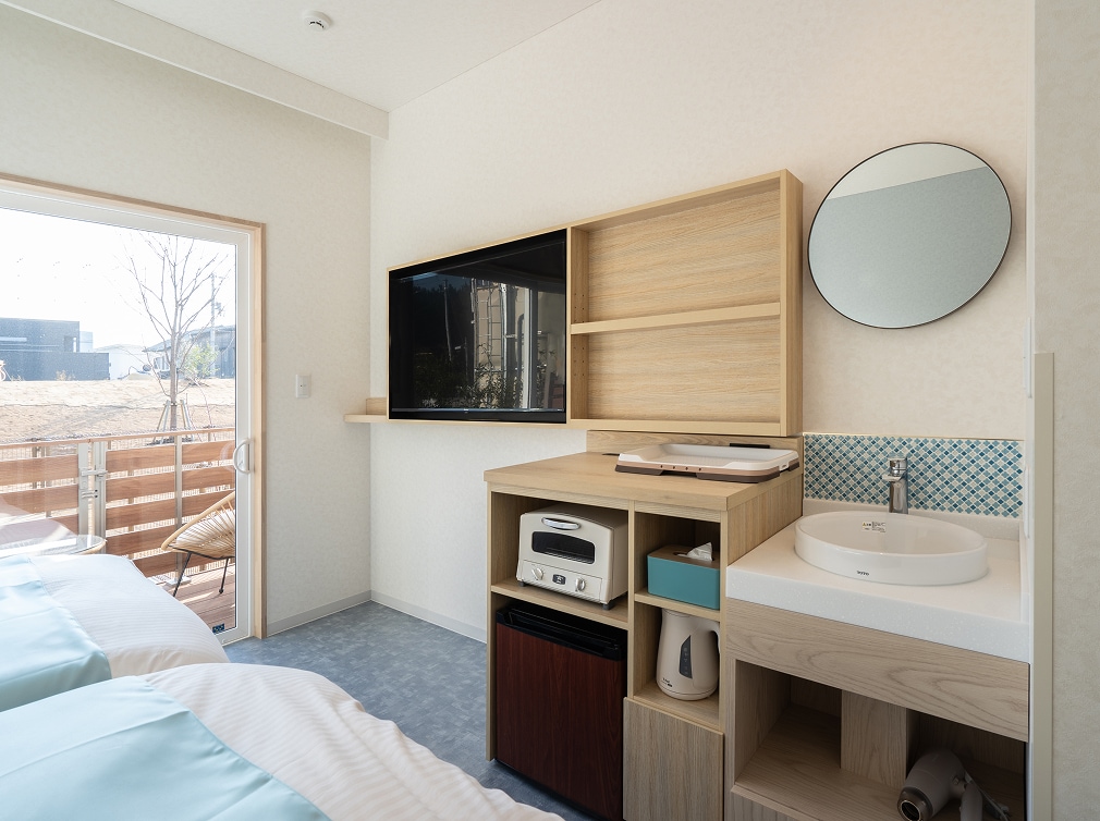 琴弾公園の松林を思わせる緑、燧灘の穏やかな青、有明浜の夕陽を映す橙色など、それぞれの土地のイメージを色彩として落とし込みました。また、全室がお庭に面したウッドデッキ付きという構成も特徴のひとつ。