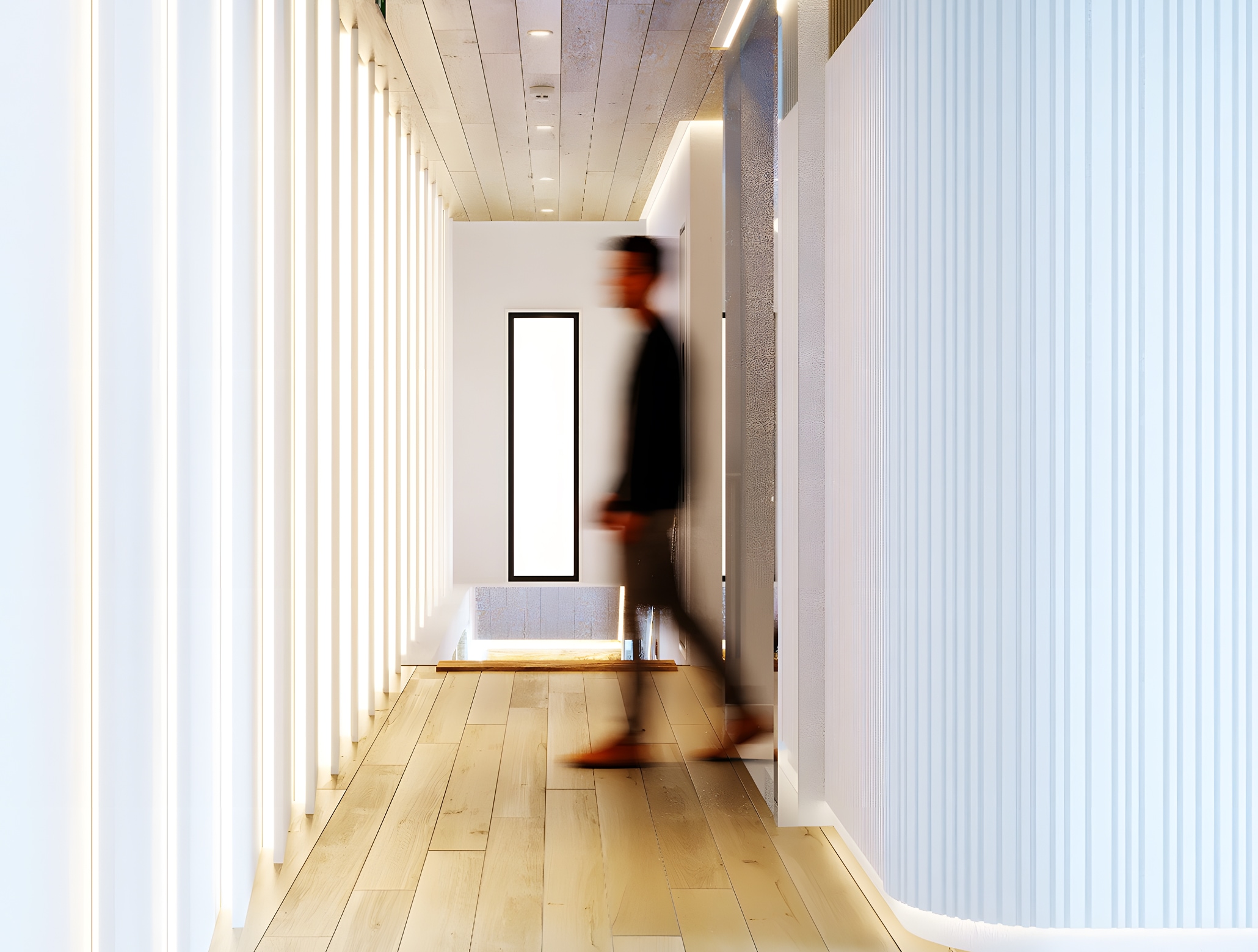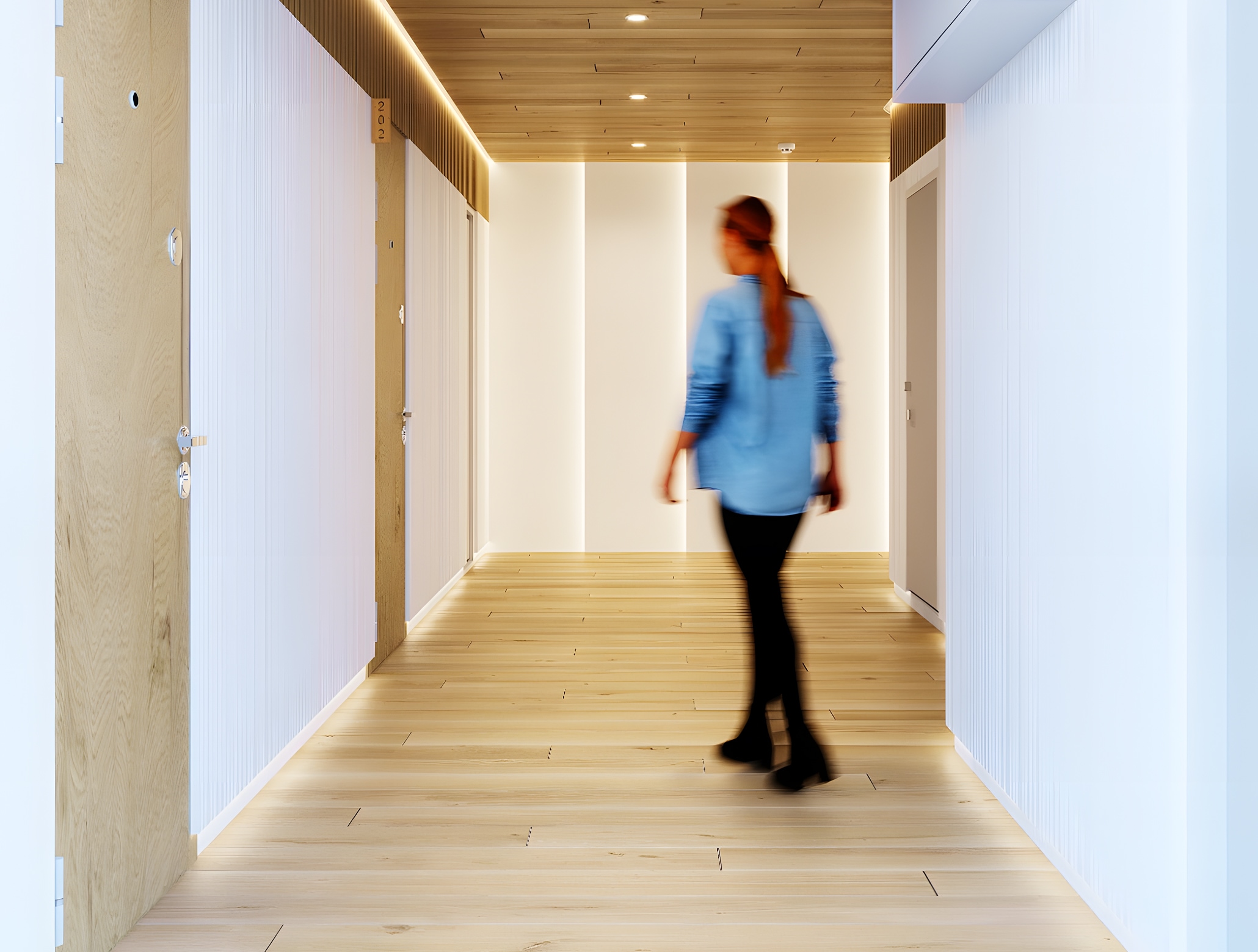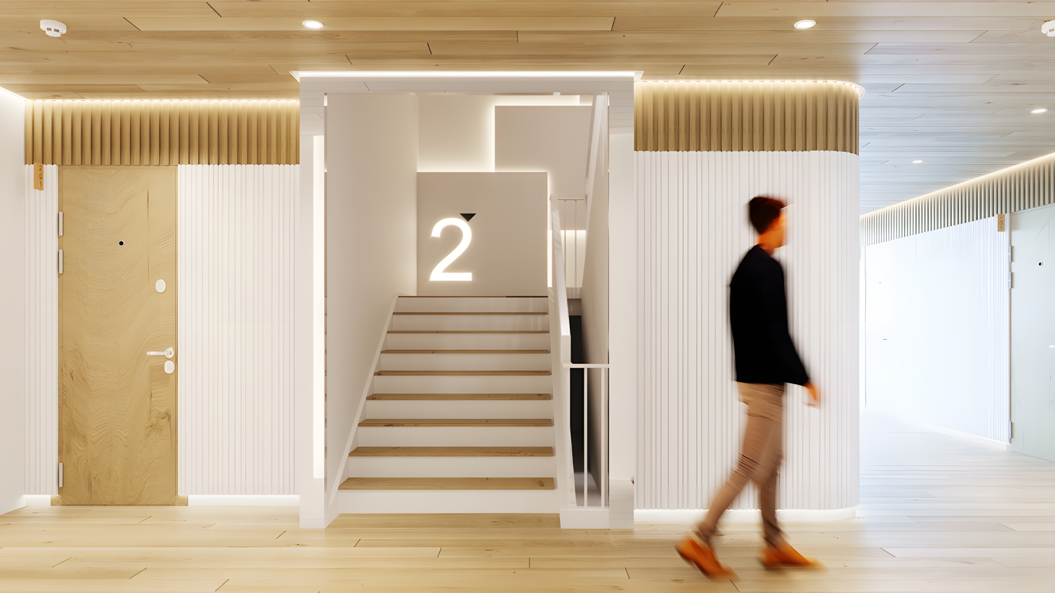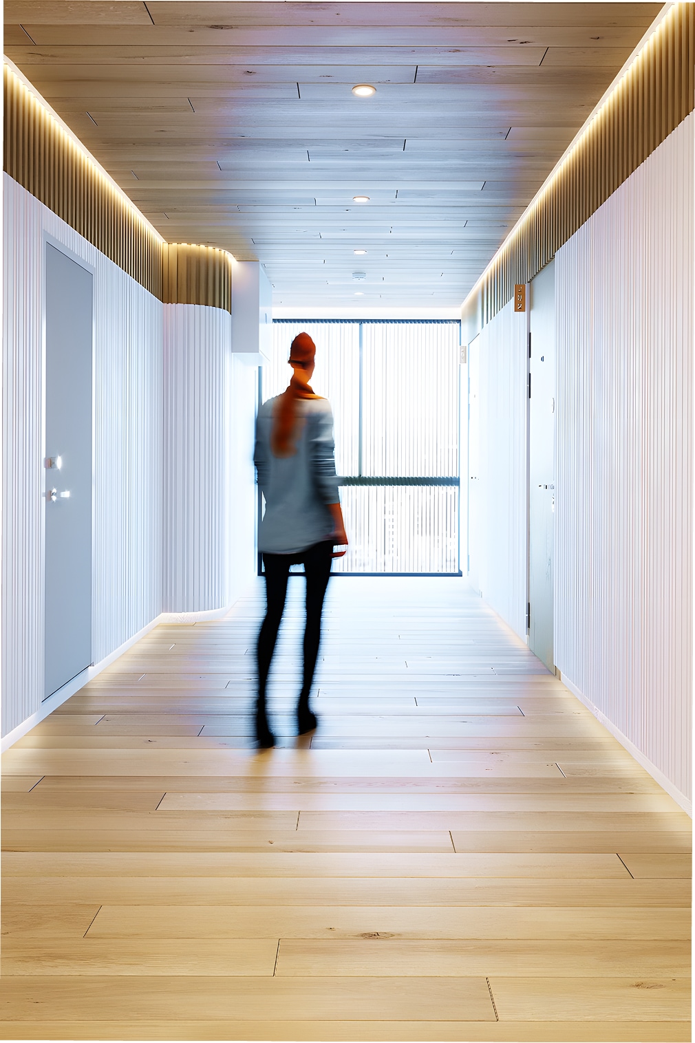 内部空間は一転して、明るい木目とホワイトを掛け合わせたミニマムなデザインに集約。装飾を削ぎ落としたタイムレスな美しさを追求することで、利用者の感性を刺激しつつ、長期的な運用においても飽きのこない普遍的なオフィス環境を具現化しています。