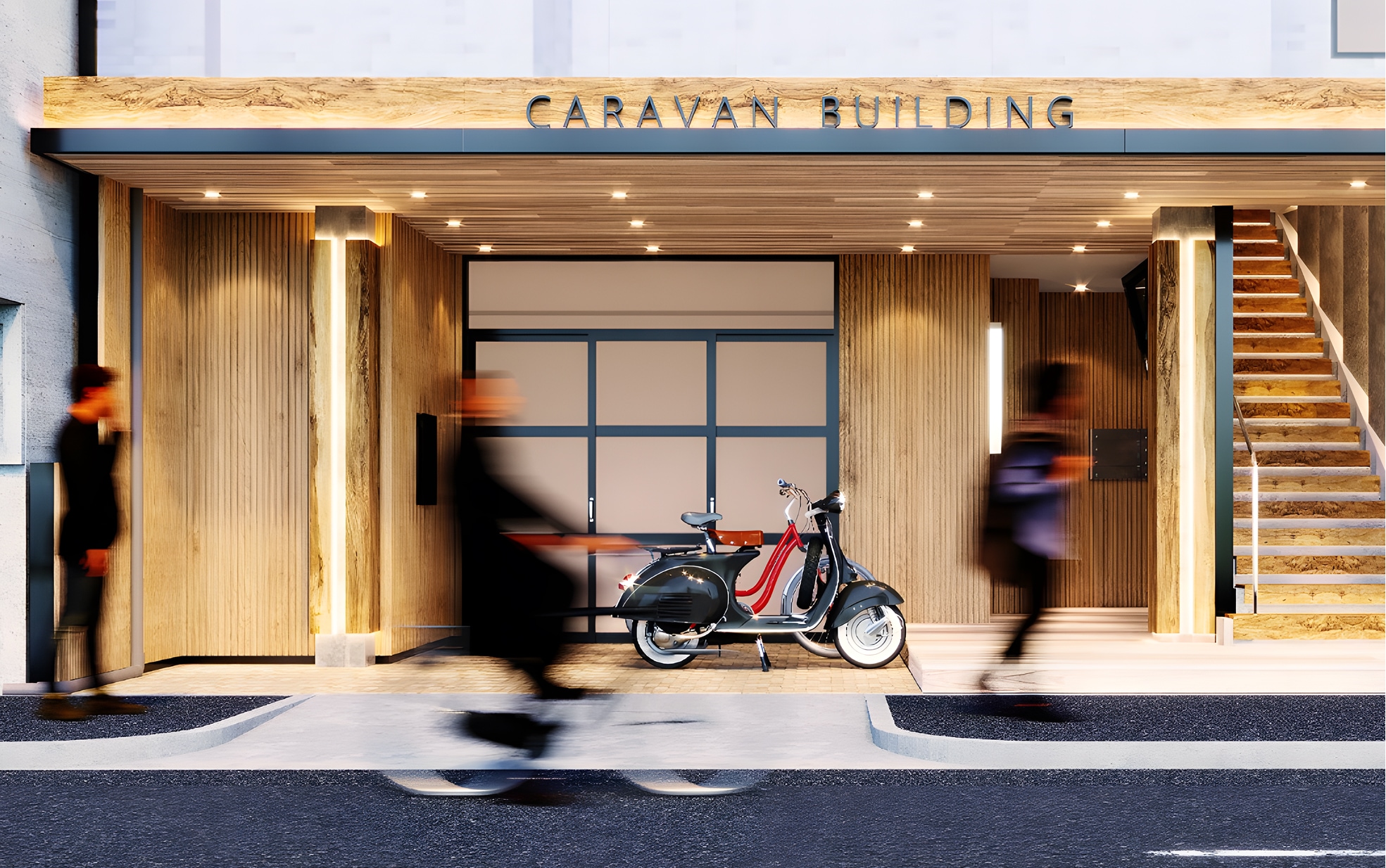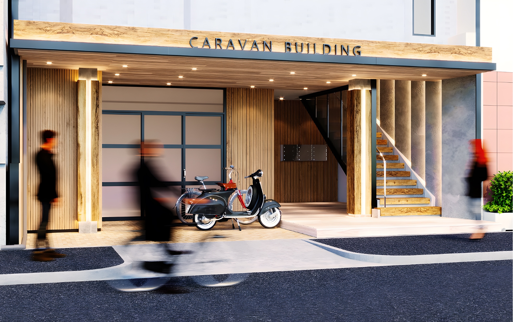 大阪市内のオフィスビルにおける、エントランスおよび内装のデザイン業務を担当。エントランスは、木の質感を活かした温かみのある佇まいでビルのアイデンティティを創出しました。